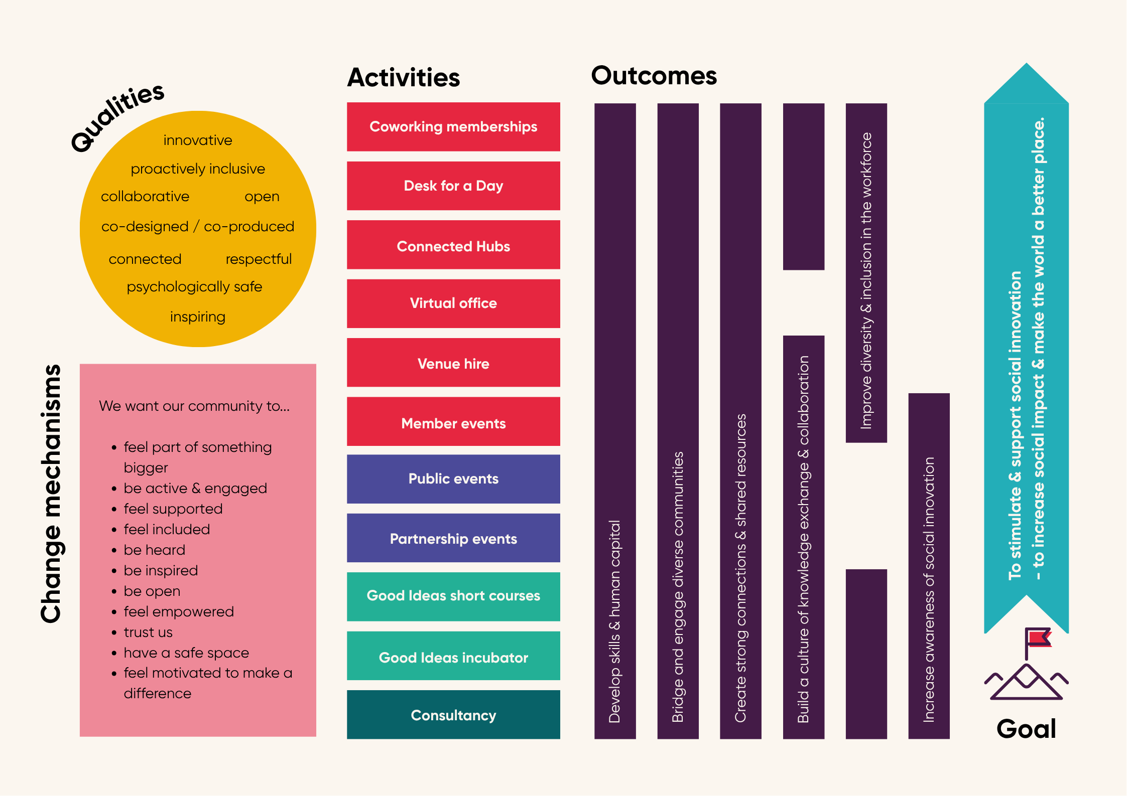 Below is our Theory of Change, outlining the qualities, change mechanisms, activities, intermediate outcomes and long-term goal of our work.