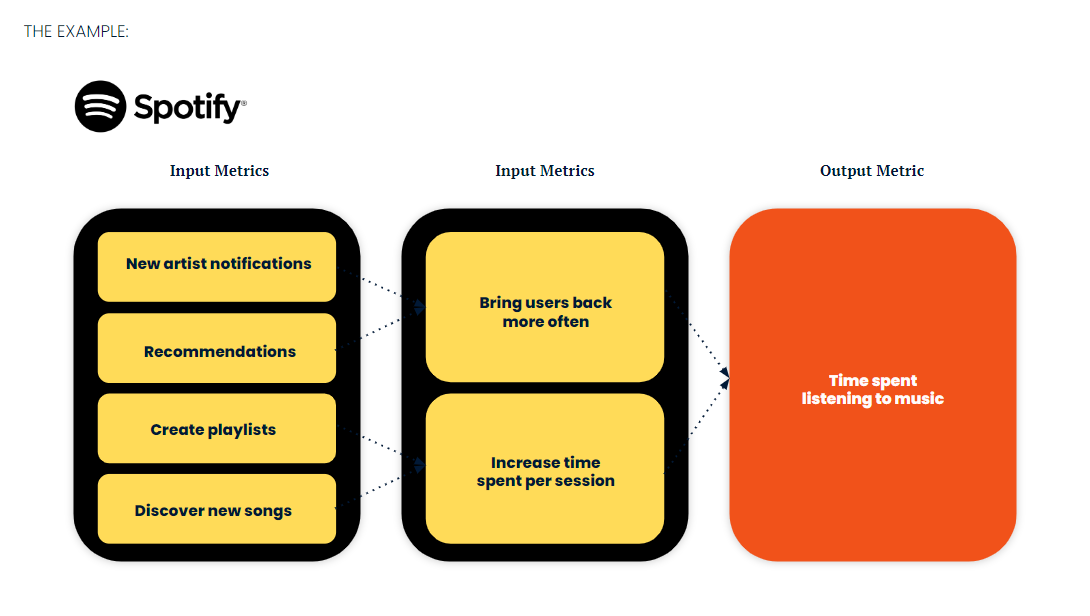 Spotify, is a great example of a traditional North Star Metric, and if you are a Spotify super fan you will recognise some of the input metrics designed to funnel you towards their NSM.